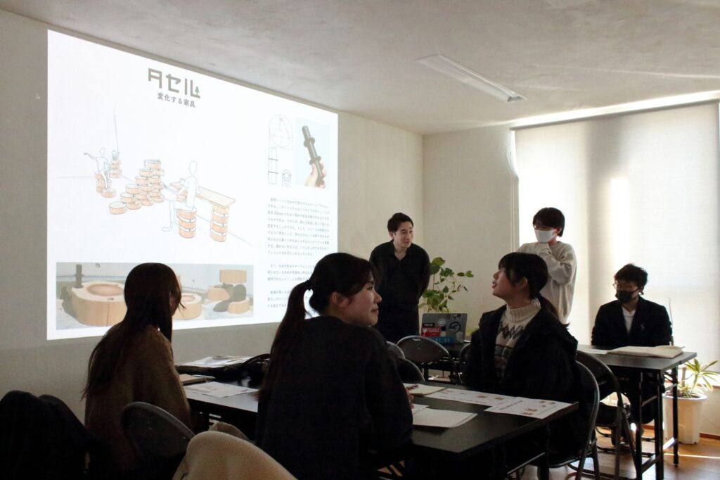 学生さんによる天竜材を活用した新たな家具のデザイン案のプレゼン風景。