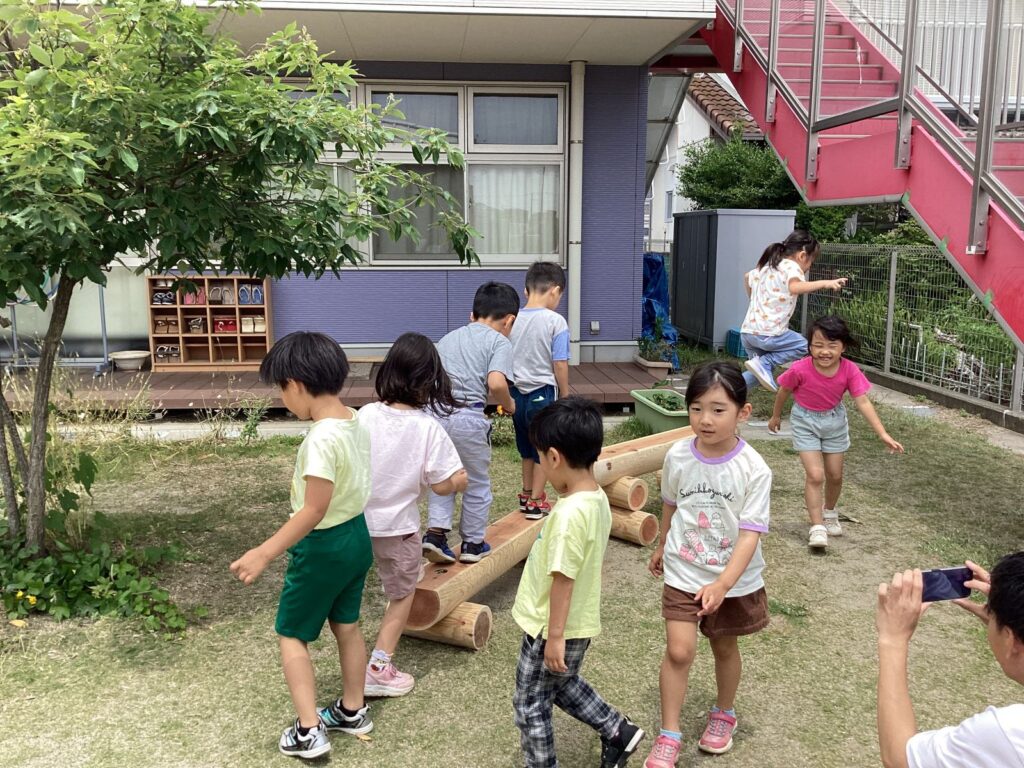 丸太の遊具を設置すると、さっそく小さな子どもたちが楽しそうに遊んでくれました。